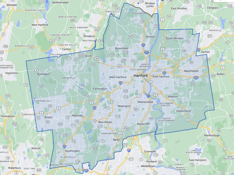 Avon, Berlin, Bloomfield, Bristol, Burlington, East Glastonbury, East Hartford, East Windsor Hill, Farmington, Glastonbury, Hartford, Manchester, Marion, Milldale, New Britain, Newington, Plainville, Plantsville, Poquonock, Rocky Hill, South Glastonbury, South Windsor, Southington, Unionville, West Hartford, Wethersfield, Windsor