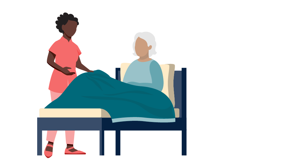 Person in a teal shirt offers a red mug to an elderly person resting in bed, next to a side table with a lamp and plant.