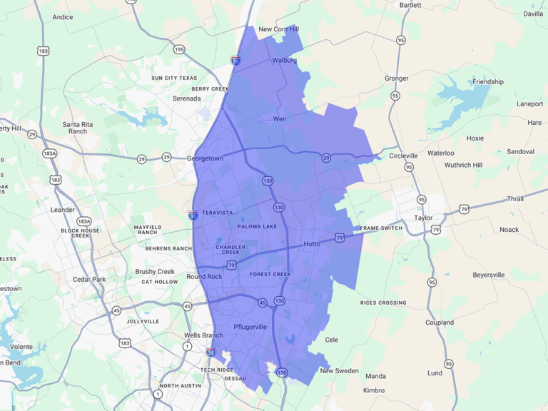 Chandler Creek, Forest Creek, Georgetown, Hutto, Paloma Lake, Pflugerville, Round Rock, Teravista, Walburg, Weir