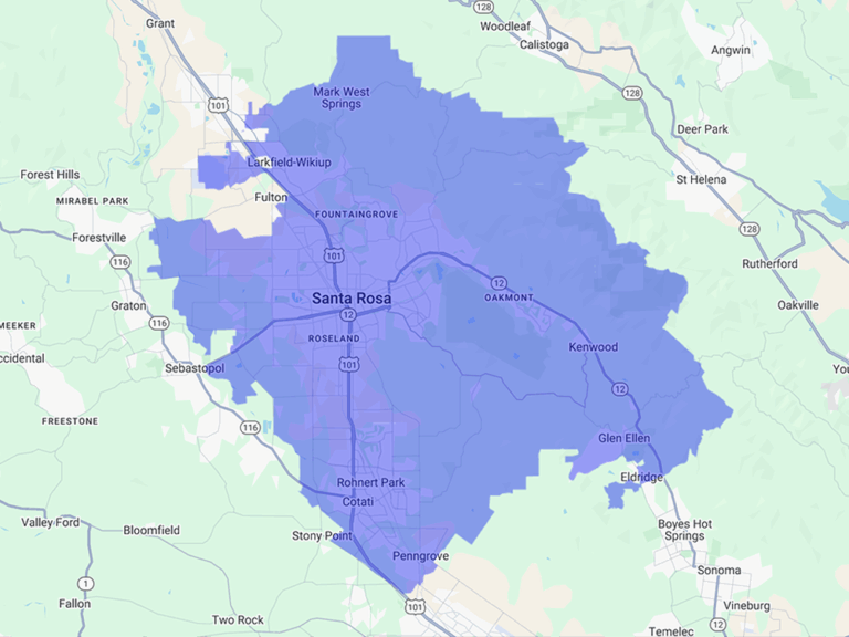 Cotati, Eldridge, Fountaingrove, Glen Ellen, Kenwood, Larkfield-Wikiup, Mark West Springs, Oakmont, Penngrove, Rohnert Park, Roseland, Santa Rosa